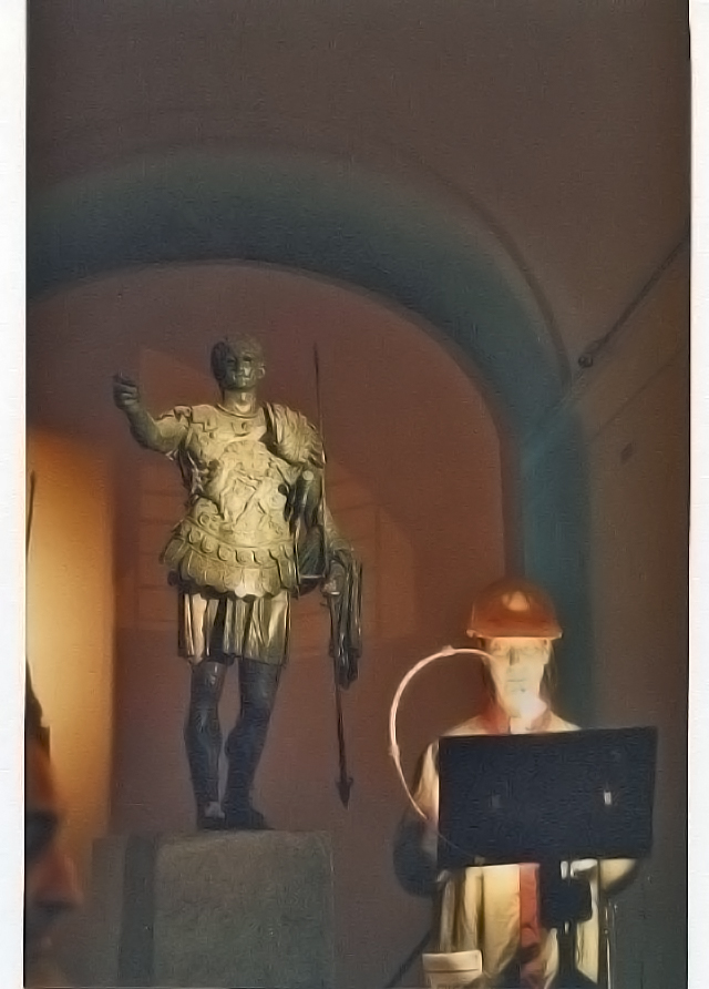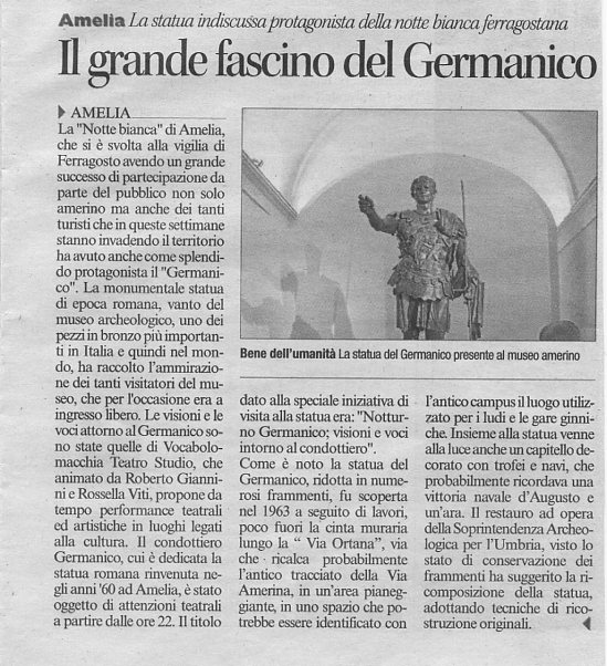 “Perugia capoluogo prepotente” .. così i due attori del Teatro Ippocampo (ora Vocabolomacchia teatro.studio), una ragazza bravissima e un altrettanto preparato collega, critici e graffianti, che con ironia hanno rifatto la storia della statua bronzea del Germanico, dal giorno del ritrovamento fino ad oggi.”