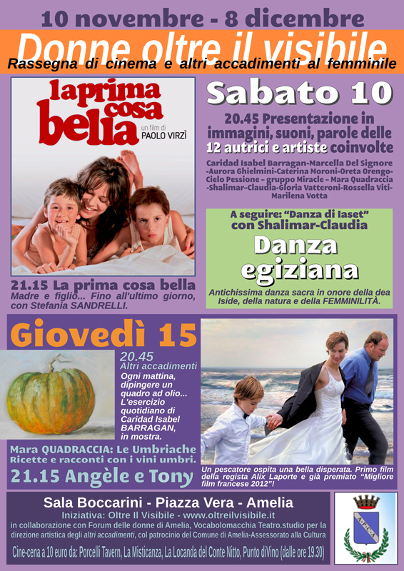 L’associazione culturale Oltre il Visibile, in collaborazione con Vocabolomacchia Teatro.studio per la direzione artistica degli altri accadimenti, il Forum delle Donne di Amelia e con il patrocinio del Comune di Amelia (Ass.to alla Cultura), propone dal 10 novembre all’8 dicembre c/o la Sala Boccarini di Amelia (p.zza Augusto Vera) la Rassegna dal titolo Donne oltre il visibile. Rassegna di cinema ed altri accadimenti al femminile.