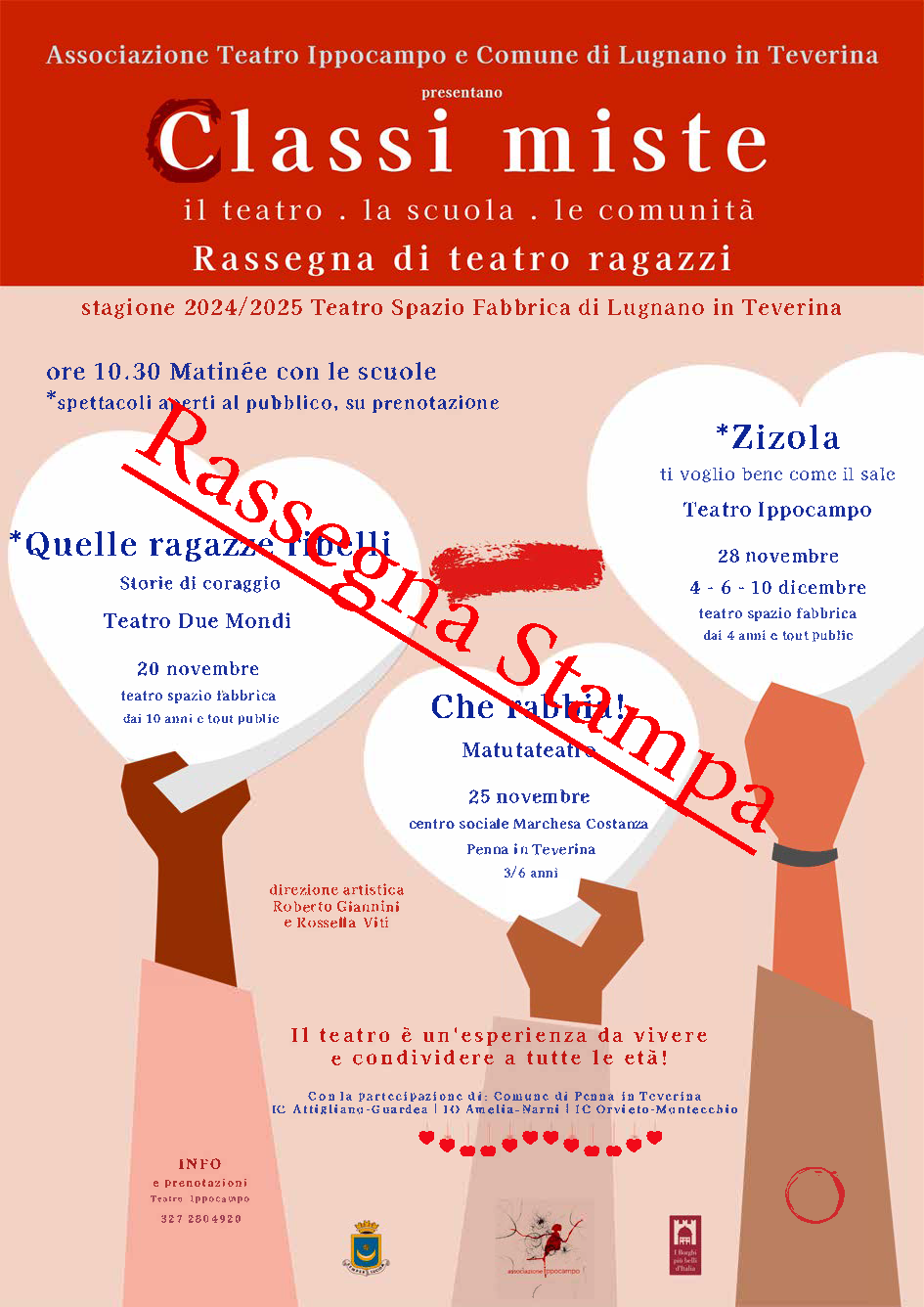 È in arrivo al teatro Spazio Fabbrica di Lugnano in Teverina “Classi miste – teatro, scuola, comunità”, la prima rassegna di teatro-ragazzi nata dalla collaborazione tra l’Associazione Teatro Ippocampo, che ne cura la direzione artistica e l’organizzazione, e