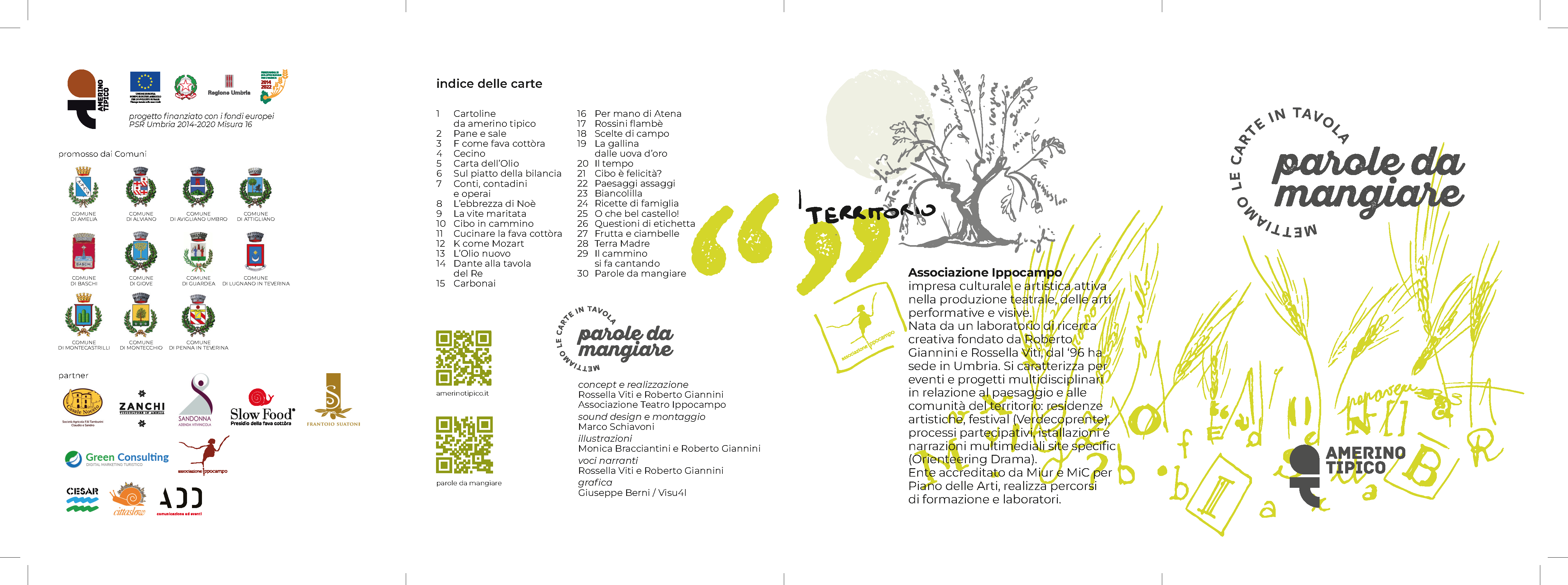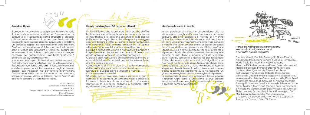 In un percorso di ricerca e osservazione che ha attraversato i luoghi del lavoro, fra campi e cammini coltivati, abbiamo esplorato il mondo di Amerino Tipico, incontrando e intervistando chi produce e chi consuma, chi amministra, chi condivide pensieri e visioni. Ne sono emersi profili di storie personali fatte di sensibilità, competenza, sacrificio, passioni e utopie, in cui si riflette questo territorio al presente e al passato. Storie che abbiamo mescolato con quelle antiche di miti, fiabe e novelle, così da viaggiare oltre i confini, temporali e geografici, per raccontare il cibo che nasce dalla terra nei tanti significati che l’uomo gli ha dato nella storia. Seguendo strade della composizione narrativa e visiva non meno di logiche stagionali, climatiche e colturali, ci ritroviamo in mezzo a tanti racconti. Ne scegliamo 30 e ne facciamo un gioco per mangiatori di cibo e mangiatori di parole. Le audio carte si ascoltano facilmente, basta leggere il Qrcode. Ogni carta è una storia, si può giocare ascoltandola insieme agli altri, a tavola o in cammino, o spedirla come una cartolina.
