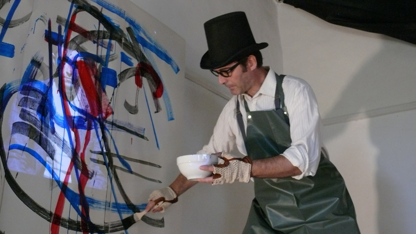 Una performance che gioca sul piano visivo attraverso tre scritture istantanee capaci di riorganizzarsi velocemente in nuove forme e modalità narrative, conducendo l’ignaro spettatore in una nuova rappresentazione di sé.