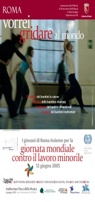 Evento performativo finale presso: Teatro Brancaccino, Rassegna teatro-scuola ‘Su il sipario’ Roma – Auditorium di Firenze, nell’ambito del I° Children’s World Congress on Child Labour.